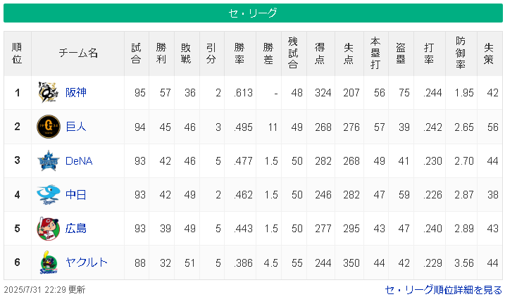 阪神なぜか負けてもゲーム差が縮まらない