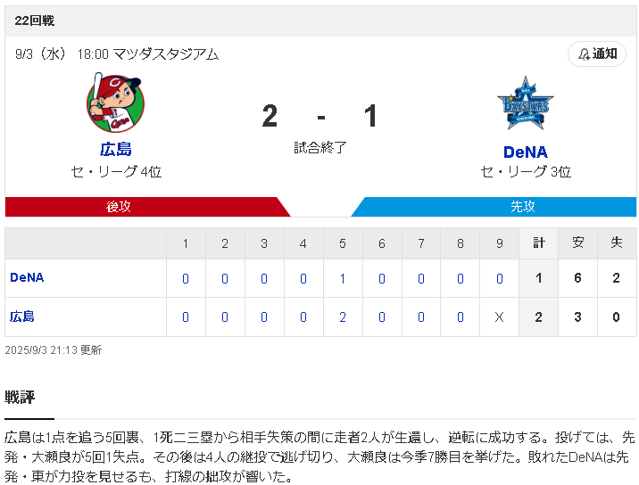 DeNA 6安打1得点