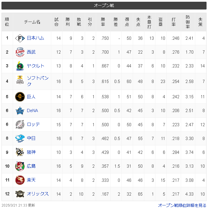 オープン戦勝率8割→開幕1ヶ月勝率2割未満