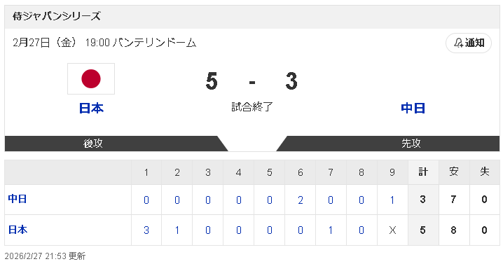 ◇28日 ラグザス 侍ジャパンシリーズ2026 壮行試合 侍ジャパン7―3中日(バンテリン)